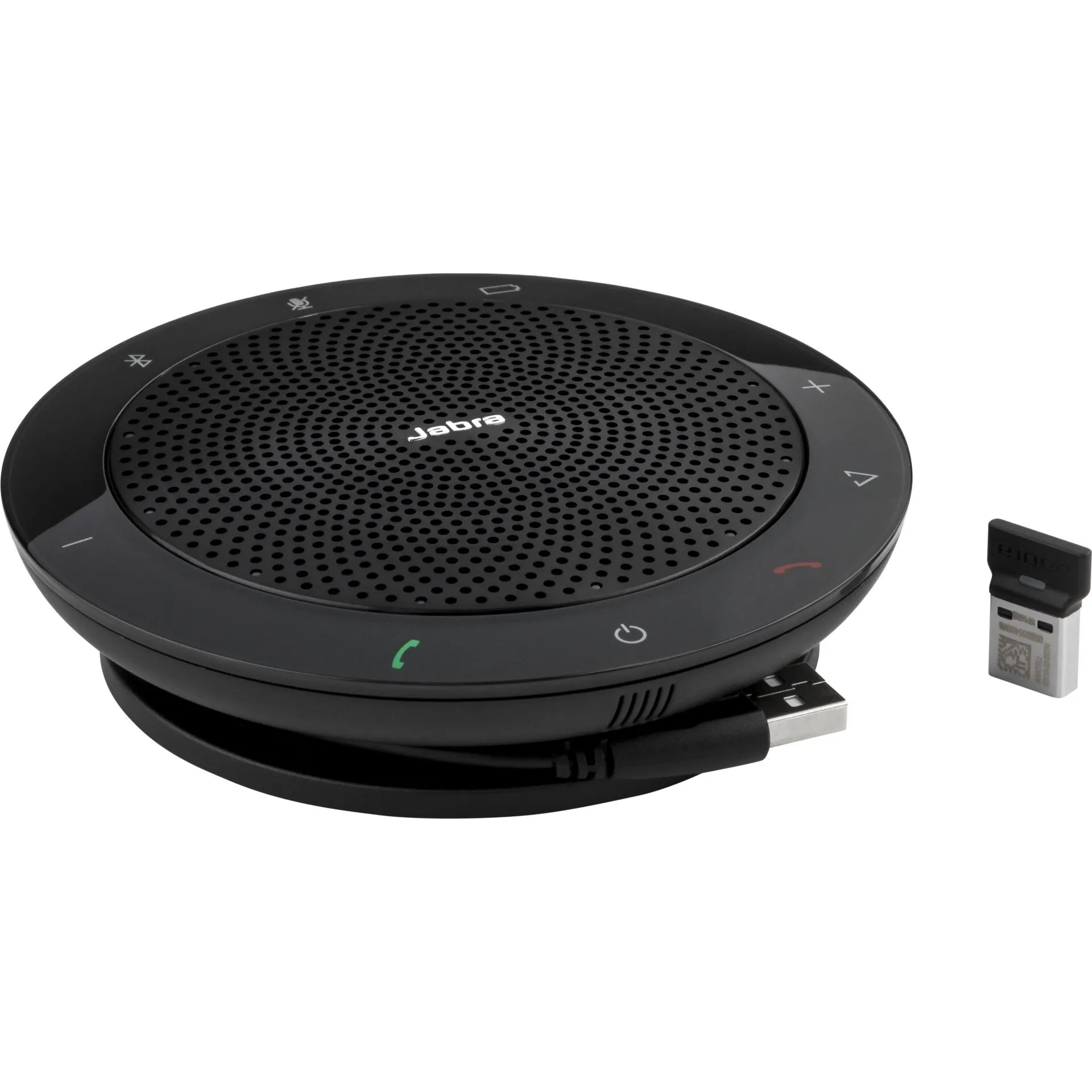 The Jabra Speak 510 MS with Link 370 is a compact, plug‑and‑play speakerphone designed for meetings, calls, and conference calls. Its high‑quality speaker captures voice clearly and projects sound throughout a small to medium room, making group calls easier. The device connects via USB or Bluetooth, and the included Link 370 USB dongle ensures stable wireless pairing with computers.